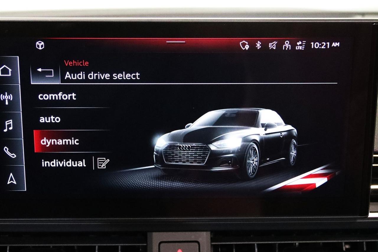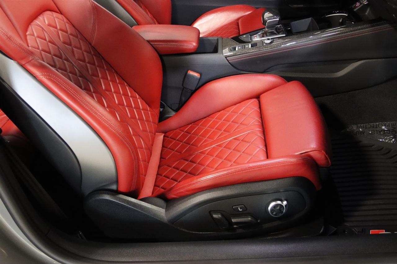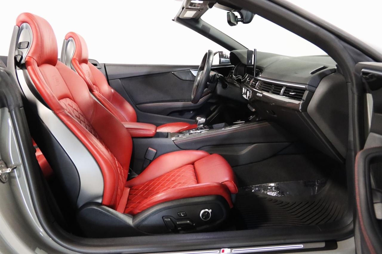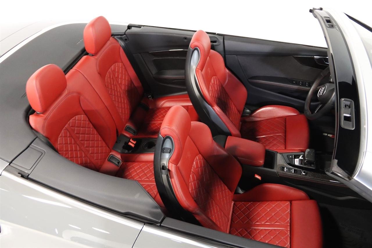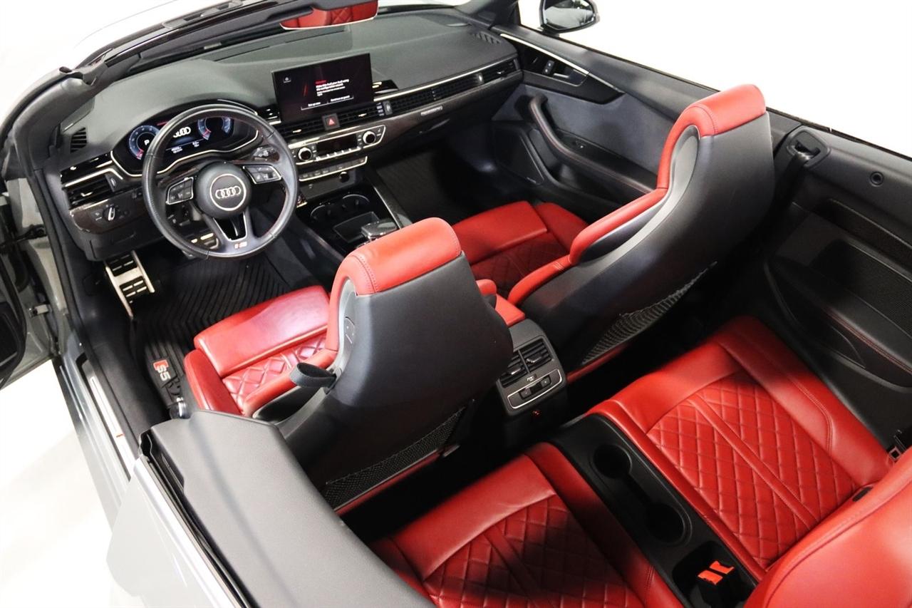 Bluetooth, Back Up Camera, Soft Top, Heated Seats, Touch Screen, 10 Speakers, 4-Wheel Disc Brakes, ABS brakes, Air Conditioning, Alarm System w/Motion Sensor, Alloy wheels, AM/FM radio, Audi Active Lane Assist, Audi Adaptive Cruise Control w/Traffic Jam Assist, Audi Advanced Key, Audi Guard All-Weather Mats, Audi Phone Box, Audi S Beam - Front Doors Only, Audi Side Assist w/Pre Sense Rear, Audi Virtual Cockpit Plus, Auto High-beam Headlights, Auto-Dimming Exterior Mirrors, Auto-dimming Rear-View mirror, Automatic temperature control, Bang & Olufsen Sound System w/3D Sound, Brake assist, Bumpers: body-color, Compass, Convenience Package, Convertible roof lining, Convertible roof wind blocker, Delay-off headlights, Driver door bin, Driver Seat Memory, Driver vanity mirror, Dual front impact airbags, Dual front side impact airbags, Electronic Stability Control, Emergency communication system: Audi connect CARE, Exterior Parking Camera Rear, Fine Nappa Leather Seating Surfaces, Four wheel independent suspension, Front anti-roll bar, Front Bucket Seats, Front Center Armrest, Front dual zone A/C, Front fog lights, Front reading lights, Garage door transmitter: HomeLink, Glass rear window, Hands-On Detection Steering Wheel, Heated door mirrors, Heated Front S Sport Seats, Heated front seats, Heated Steering Wheel, Illuminated entry, Integrated roll-over protection, Integrated Toll Module Delete, Knee airbag, Leather Shift Knob, Leather steering wheel, Leatherette Covered Center Console & Door Armrests, Low tire pressure warning, Occupant sensing airbag, Outside temperature display, Panic alarm, Parking System Plus, Passenger door bin, Passenger vanity mirror, Power convertible roof, Power door mirrors, Power driver seat, Power Folding Exterior Mirrors, Power passenger seat, Power steering, Power windows, Premium Plus Package, Radio data system, Radio: Audi Sound System, Rain sensing wipers, Rear air conditioning, Rear anti-roll bar, Rear reading lights, Rear window defroster, Red Brake Calipers, Remote keyless entry, S Sport Package, Semiconductor Shortage Credit, SiriusXM All Access Service, Speed control, Speed-sensing steering, Speed-Sensitive Wipers, Split folding rear seat, Sport Adaptive Damping Suspension, Sport Exhaust Resonator, Sport Rear Differential, Steering wheel mounted audio controls, Tachometer, Telescoping steering wheel, Tilt steering wheel, Top View Camera System, Traction control, Trip computer, Turn signal indicator mirrors, USB Cables, Variably intermittent wipers, Wheels: 19" 5-Double-Arm Design Bi-Color Finish. Clean CARFAX. 21/28 City/Highway MPG